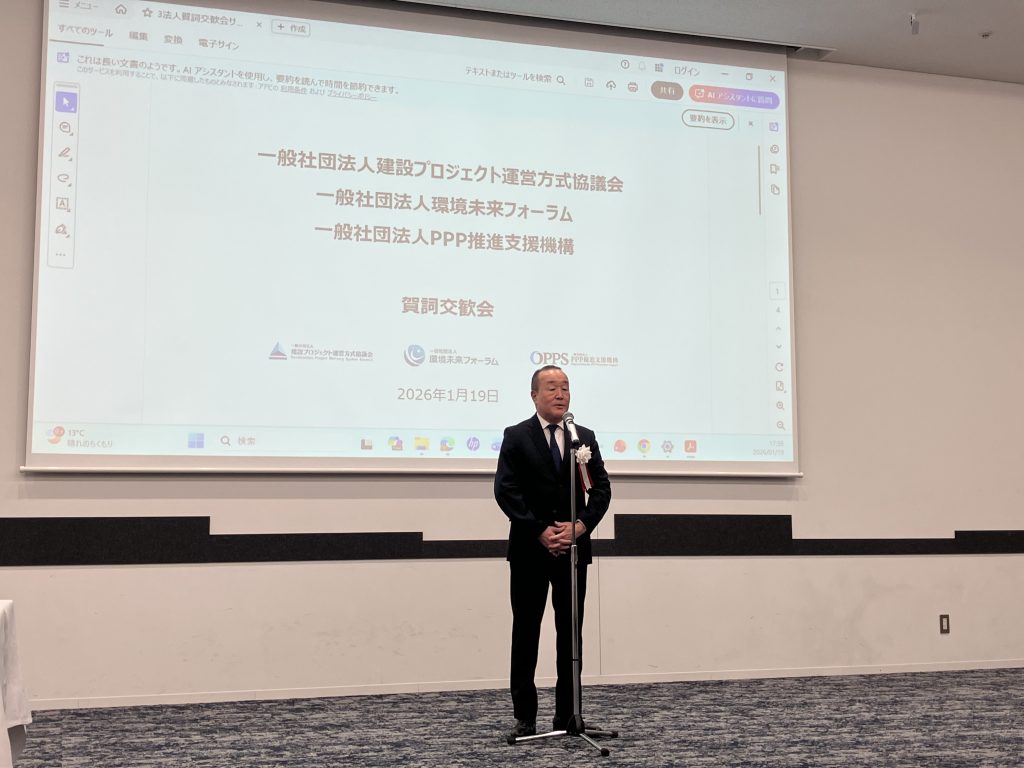 2026年1月19日、一般社団法人環境未来フォーラム(KMF)、一般社団法人建設プロジェクト運営方式協議会(CPDS)、一般社団法人PPP推進支援機構(OPPS)の3法人合同の新年賀詞交歓会が東京都港区で開催されました。